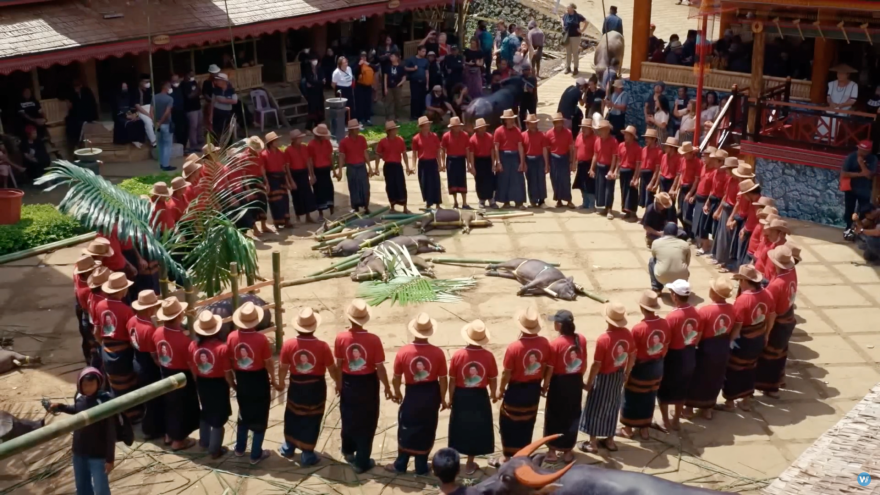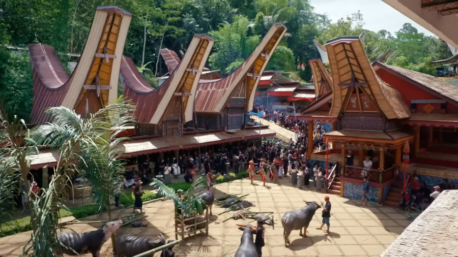 zuletzt sollen viele Büffel aus Anlass der Zeremonie geopfert werden, zur Verpflegung der Arbeiter und Gäste, aber auch, weil der Büffel das zentrale Symbol in der Kultur der Toraja darstellt.