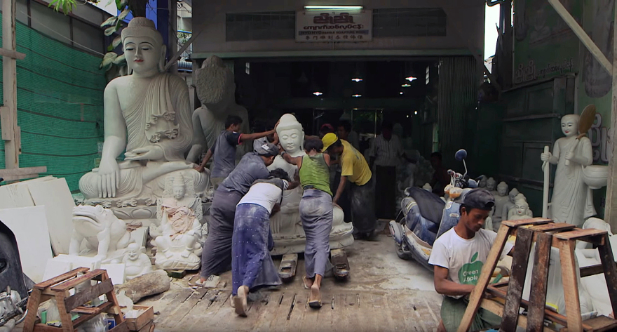 U Po Ther gilt als einer der besten Bildhauer von Sagyin. Per Handy verhandelt er im ehemals isolierten Myanmar mit Auftraggebern aus ganz Asien. Denn Buddha-Figuren sehen immer unterschiedlich aus. Jedes Land hat seinen eigenen Stil. Und auch jede Pose hat ihre Bedeutung.
